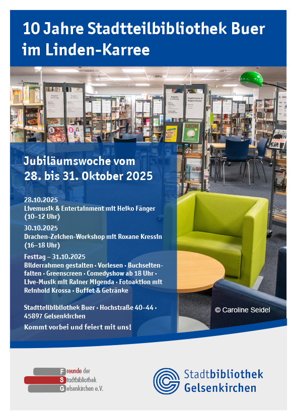 Vom 28. bis 31. Oktober 2025 feiert die Stadtteilbibliothek Buer ihr zehnjähriges Bestehen. Vier Tage Programm für Kinder, Familien und Kulturfans.