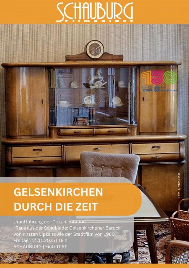 Gezeigt wird der Film „Raus aus der Schublade: Gelsenkirchener Barock“ am Freitag, 14. November 2025 um 18 Uhr in der Schauburg. In Kooperation mit dem Institut für Stadtgeschichte Gelsenkirchen und unter dem Motto „Gelsenkirchen durch die Zeit“ seht ihr direkt danach auch noch einen zweiten Film: den Stadtfilm von 1980. Was für ein Zufall, dass das mein Geburtsjahr ist!