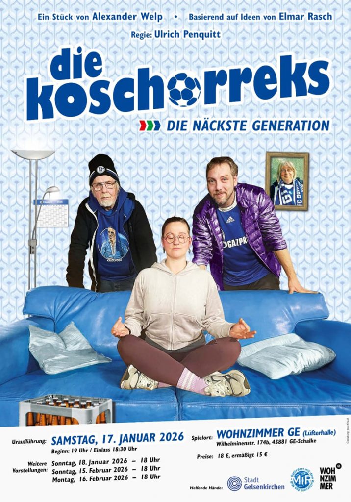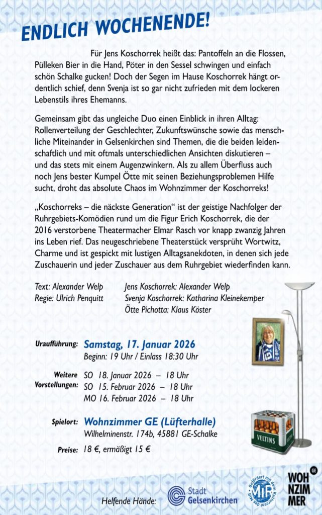 Pantoffeln an die Füße, Pülleken in die Hand und ab auf die Couch – für Jens Koschorrek könnte das Wochenende kaum schöner sein. Doch ganz so entspannt läuft es im Hause Koschorrek dann doch nicht. Svenja, seine Frau, sieht Jens’ lockeren Lebensstil nämlich deutlich kritischer. Und genau hier setzt das neue Theaterstück Die Koschorreks – Die näckste Generation an: mitten im Wohnzimmer, mitten im Ruhrgebiet, mitten im ganz normalen Alltagschaos.