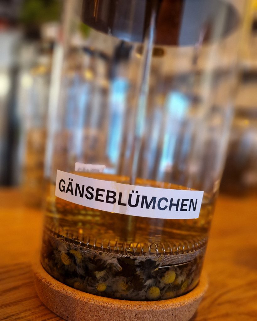 Diese wurde direkt aufgebrüht, durfte kurz ziehen und wurde erneut gemeinsam verkostet. Schnell zeigte sich, wo noch Feinschliff nötig war. Mit kleinen Anpassungen bei den Anteilen von Lavendel und Gänseblümchen entstand schließlich die Mischung Gelsenkirchen 2. Einhelliges Urteil der Runde: perfekt abgestimmt. Abgerundet wurde das Ergebnis durch die Empfehlung einer etwas längeren Ziehzeit – für ein rundes, volles Geschmackserlebnis. Ich würde kräutrig und mild sagen.
