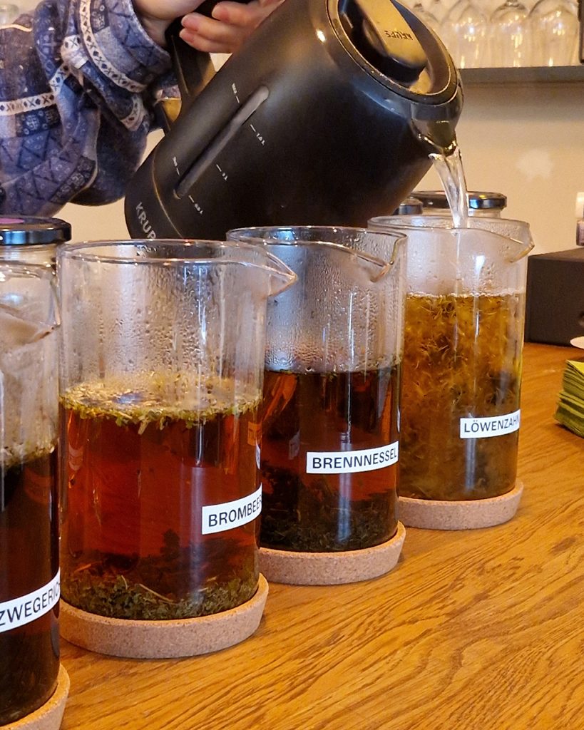 Gemeinsam wurde probiert, gerochen und diskutiert – mit dem Ziel, eine ganz eigene Kräuter-Teemischung für die Stadt zu entwickeln. Sieben heimische Kräuter und Blüten standen zur Auswahl, sorgfältig aufgebrüht und in geselliger Runde verkostet.