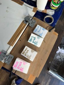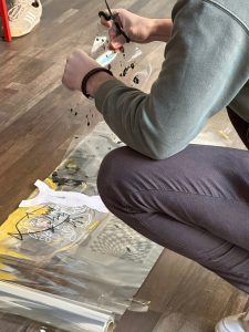 In genau diesem Moment – um genau zu sagen noch bis 15 Uhr – läuft gegenüber der Heilig-Kreuz-Kirche der Siebdruck-Workshop mit Vivian Fischer im irgendDorf an der Bochumer Straße 108. Es entsteht ein kollektives Plakat aus verschiedenen Siebdruckmotiven, die in dem Workshop gestaltet werden. Hier ein kleiner Einblick dazu.