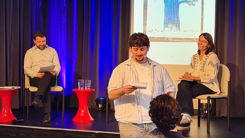 Im Anschluss präsentierte Jwanzeen seinen neuen Text „Ich wäre gern eine 10 von 10…“. Die Performance ging stellenweise ins Jammen über. Rhythmisch, intensiv und voller Energie. Inhaltlich stellte der Text große Fragen: Wann gehöre ich dazu? Warum bleiben manche Türen verschlossen, während andere scheinbar mühelos Teil einer Gemeinschaft werden? Themen, zum Nachdenken anregten.