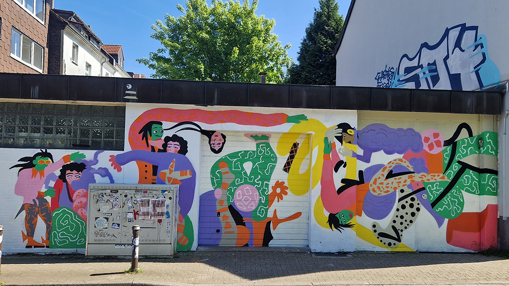 An der Munscheidstraße gegenüber vom Wissenschaftspark ist eine neue Fassadengestaltung zu sehen. Das Ganze ist im Rahmen eines partizipativen Projekts entstanden, das Künstlerin Hülya Özkan gemeinsam mit Jugendlichen aus dem together gelsenkirchen realisiert hat. Die Teilnehmenden waren zwischen 17 und 19 Jahre alt und haben nicht nur Ideen eingebracht, sondern auch aktiv an der Umsetzung mitgewirkt.