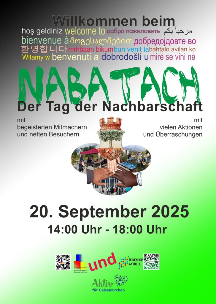 Am Samstag lädt derVerein Ückendorf Aktiv e.V. zum Tag der Nachbarschaft – NaBaTach – in den Stadtteil. Nicht nur an der Bochumer Straße findet ihr dazu überall offene Türen und viele Angebote, sondern u.a. auch Richtung Südfriedhof und Thomas-Morus-Kirche, Ückendorfer Straße und Virchowstraße. Ramonas Tanzschmiede zeigt dort zusammen mit Entspann dich. ein vielfältiges Programm und es fährt sogar ein Planwagen, um die weiter entfernten Stationen besser miteinander zu verbinden. Den Link mit weiteren Infos findet ihr >>> hier. Vor der Heilig-Kreuz-Kirche wird es auch einen Stand geben, wo ihr Flyer mit allen Infos bekommt.