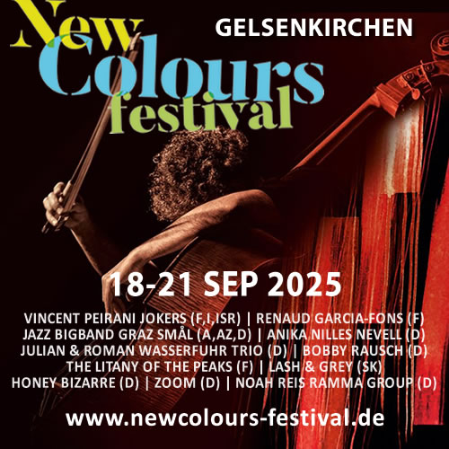 Zwei Großereignisse gliedern sich außerdem in das Festivalprogramm, das im Rahmen von 150 Jahre Gelsenkirchen zusammengestellt wurde, ein: das New Colours Festival präsentiert an Orten wie Schloss Horst, stadt.bau.raum, Matthäuskirche und Bleckkirche ausgesuchte Acts aus den Bereichen New Jazz, die teilweise sogar ins elektronische und rockige abschweifen. Am Sonntag gibt es ein großes Abschlusskonzert in der Heilig-Kreuz-Kirche mit der renommierten Drummerin Anika Nilles. Das Programm dazu findet ihr hier: https://colours-festival.de/