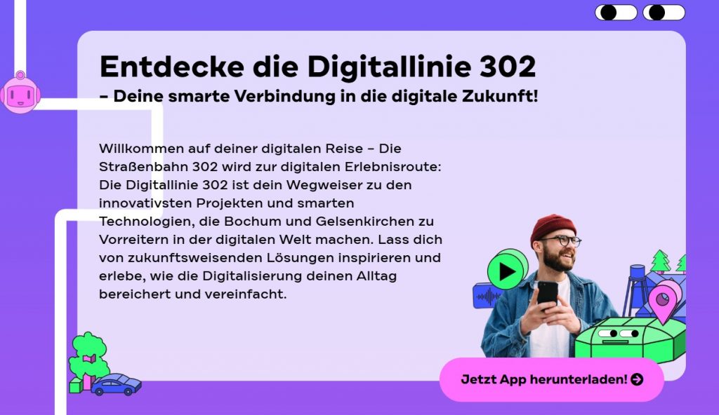 Das gemeinschaftliche Projekt (Bochum-Gelsenkirchen) „Digitallinie 302“ ist natürlich auch mit dabei – und das auch jederzeit außerhalb des Kulturspur-Rahmens: Die Digitallinie 302 führt dich durch die digitalen Highlights der Stadt – von smarter Mobilität bis hin zu nachhaltigen Lösungen.