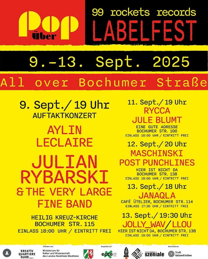 Das Musikprojekt rund um 99 rockets records, einem erfahrenen Musiklabel aus Gelsenkirchen, feiert sein erstes großes Labelfest – und lädt vom 9. bis 13. September zu einer Reihe von Konzerten im Kreativquartier Ückendorf ein.