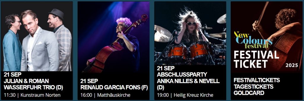 Jazz – das scheint gar nicht so zu sein, wie ich immer dachte. Klar, kann ich mich daran erinnern, dass mein Musiklehrer davon sprach, wie viele verschiedene Arten von Jazz es gibt. Aber selbst hören? War irgendwie nicht drin. Im Februar habe ich es dann doch einmal gewagt und war mehr als positiv überrascht, was das niederländisch-amerikanische Philippe Lemm Trio aus seinen Instrumenten hervorzauberte. Traditioneller Jazz, gepaart mit Einflüssen von Rock, Pop und Klassik. Habe ich natürlich irgendwo gelesen – ich höre zwar gerne Musik, aber da bin ich keine Expertin 😉 Hat mir aber so gut gefallen, dass ich mich schon auf das kommende New Colours Festival vom 18. bis 21 September freue.