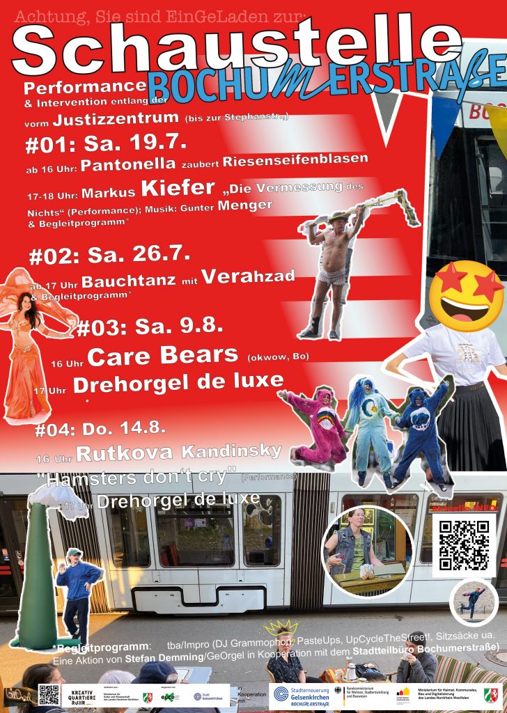 Die letzte Aktion der SCHAUSTELLE am 14.08. ab 16 Uhr wird auf jeden Fall stattfinden, um die Menschen rund um die Baustelle mit Kunst und Musik zu unterhalten und auch morgen (Samstag, 09.08.) passiert am Justizzentrum wieder eine Menge: ihr begegnet den Care Bears aus Bochum und die Drehorgel de luxe spielt euch feinste Lieder! Nächsten Samstag übrigens auch nochmal, dann allerdings in Kombination mit Rutkova Kandinsky und ihrer Performance „Hamsters don’t cry“.